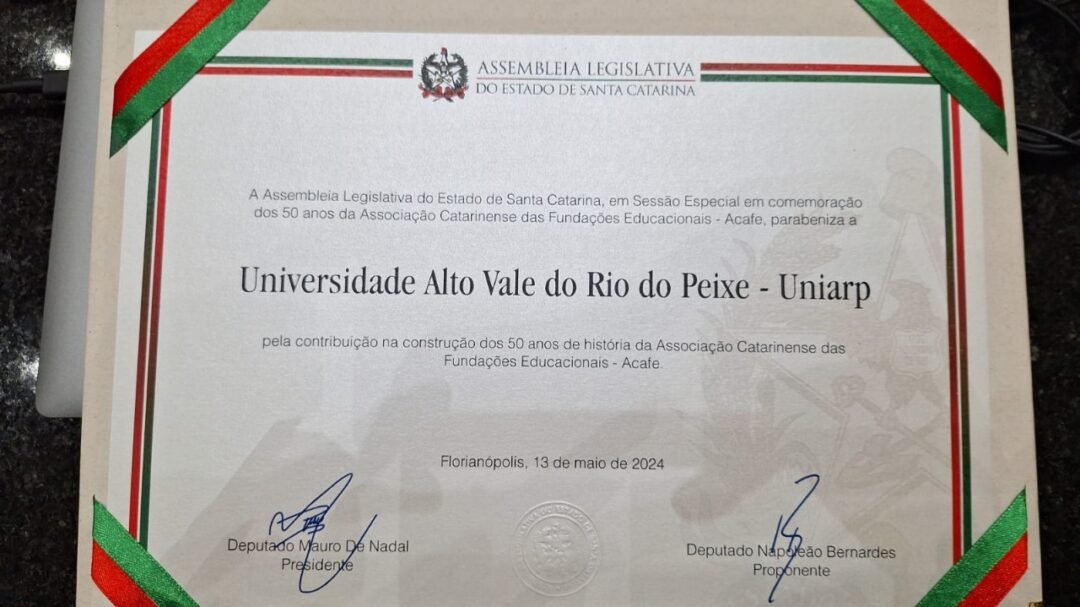 Na oportunidade, a Acafe e as universidades que a compõem receberam uma homenagem do parlamento A solenidade teve a presença do vice-reitor Acadêmico da UNIARP, professor Dr. Joel Haroldo Baade, que recebeu a placa de homenagem.