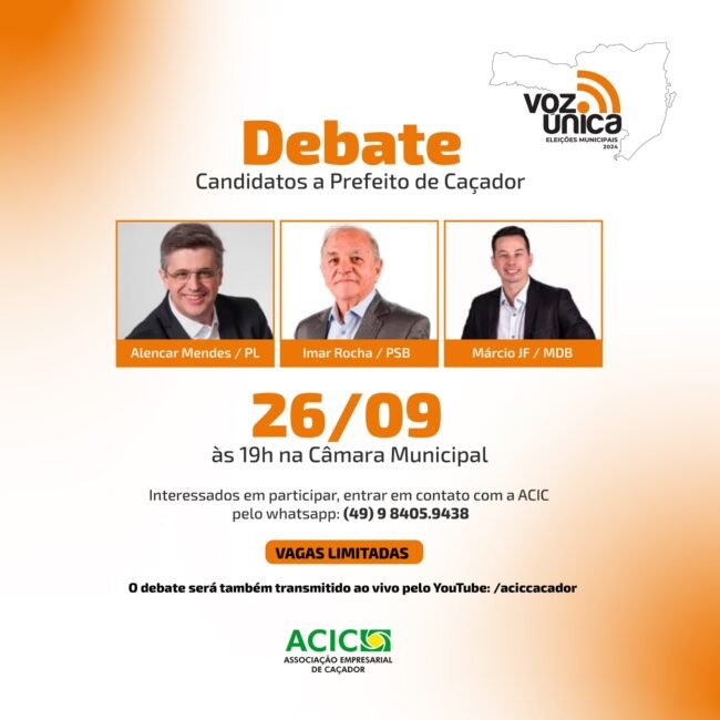 Nesta quinta-feira (26) a Associação Empresarial de Caçador (ACIC) promove seu debate com os candidatos a prefeito de Caçador, Alencar Mendes (PL), Imar Rocha (PSB) e Marcio JF (MDB). O encontro inicia às 19h na Câmara de Vereadores e terá transmissão ao vivo pelo youtube: /aciccacador