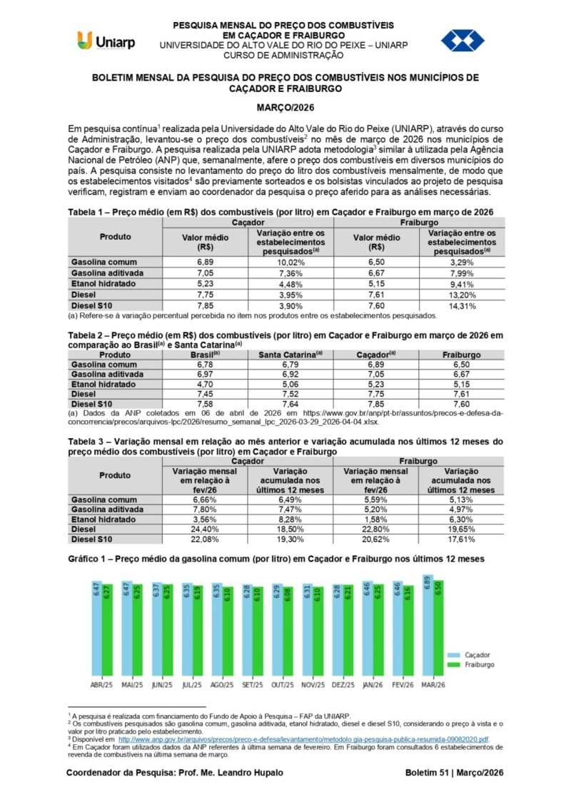 Em pesquisa contínua realizada pela Universidade Alto Vale do Rio do Peixe (UNIARP), através do curso de Administração e financiada com recursos do Fundo de Apoio à Pesquisa (FAP), levantou-se o preço dos combustíveis no mês de março nos municípios de Caçador e Fraiburgo. A pesquisa, realizada pela UNIARP e coordenada pelo professor Leandro Hupalo e executada pela bolsista Ana Laura Crestani, adota metodologia similar à utilizada pela ANP – Agência Nacional do Petróleo, Gás Natural e Biocombustíveis que, semanalmente, afere o preço dos combustíveis em diversos municípios do país.