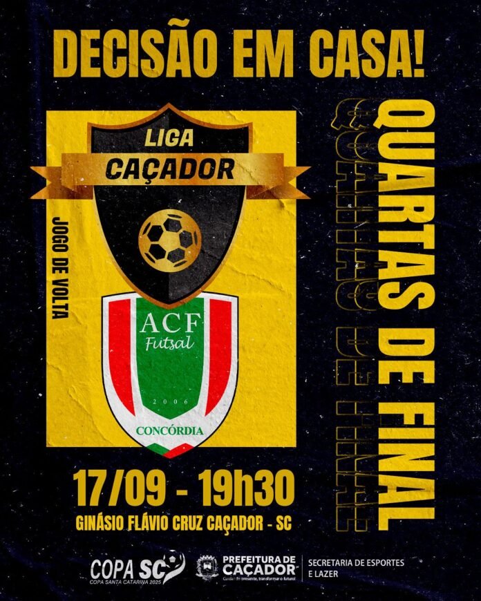 O Caçador Futsal/Secretaria de Esporte e Lazer tem um grande desafio nesta quarta-feira, 17,no Ginásio Flávio Cruz, quando recebe o Concórdia pelo jogo de volta das quartas de final da Copa Santa Catarina.