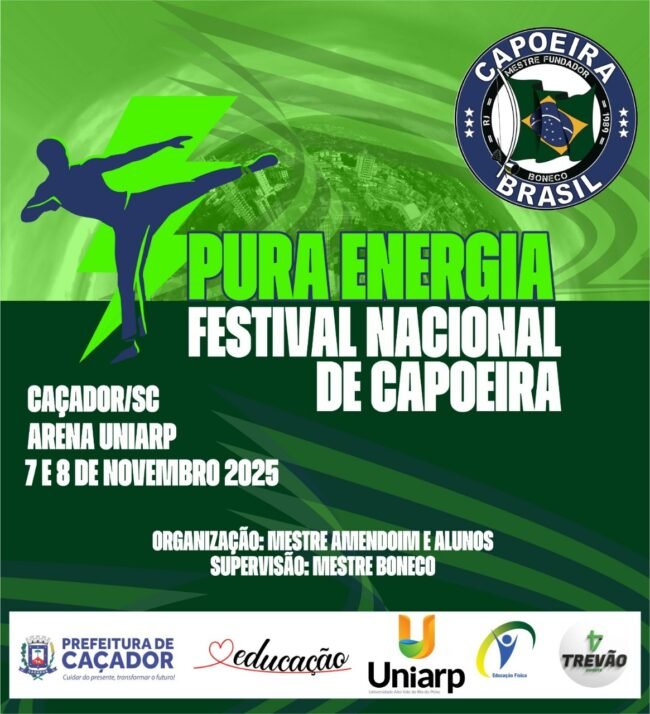A Arena UNIARP será palco do Festival Nacional de Capoeira “Pura Energia”, nos dias 7 e 8 de novembro, reunindo mestres reconhecidos internacionalmente e profissionais da área da Educação Física. O evento é promovido pela UNIARP, por meio do curso de Educação Física, com apoio da Prefeitura de Caçador, através da Secretaria Municipal de Educação e da Secretaria Municipal de Esportes e Lazer.