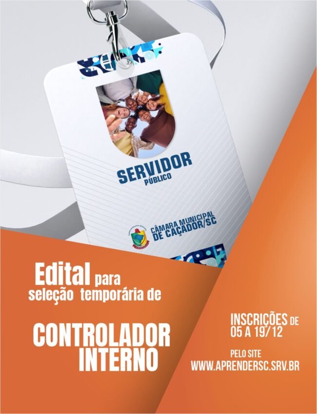 A Câmara Municipal de Caçador abriu Processo Seletivo para contratação temporária de Controlador Interno. As inscrições estarão abertas de 5 a 19 de dezembro, exclusivamente pela internet.