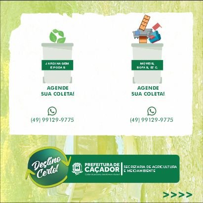 - Resíduos de jardinagem e podas: Agende a coleta pelo WhatsApp (49) 99129-9775.