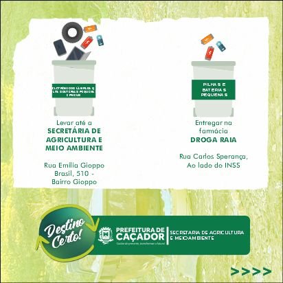 - Eletrônicos e pneus: Entregar na Secretaria de Agricultura e Meio Ambiente (Rua Emilia Gioppo Brasil, 510 – Bairro Gioppo), das 13h às 19h.