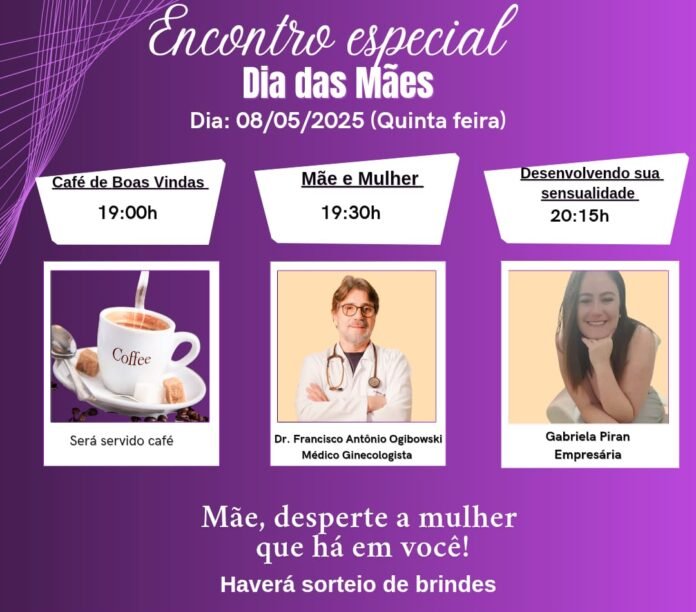 A programação será no auditório da CDL e tem início às 19h com um café de boas-vindas para recepcionar as participantes. Em seguida, às 19h30, o médico ginecologista Dr. Francisco Antônio Ogibowski conduz a palestra “Mãe e Mulher”, abordando temas ligados à saúde da mulher, maternidade e autoestima.
