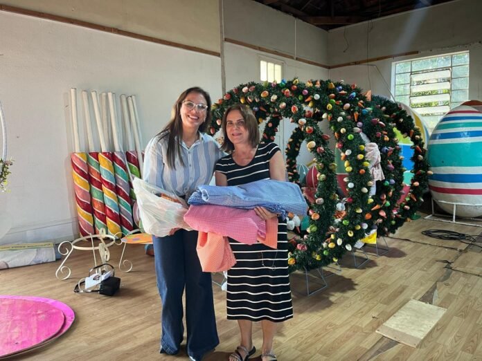 Durante o encontro, que aconteceu no barracão onde voluntários trabalham na confecção dos enfeites, a CDL entregou 50 metros de tecido xadrez e outros itens necessários para a restauração dos coelhos que farão parte da decoração de Páscoa.
