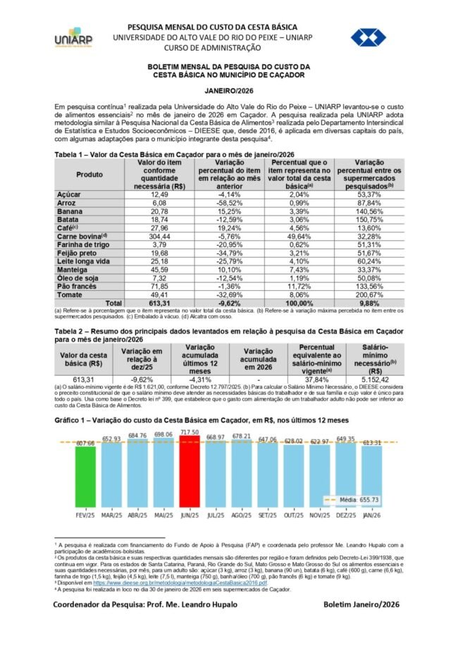 A pesquisa mensal sobre o custo da Cesta Básica realizada pelo curso de Administração da Universidade Alto Vale do Rio do Peixe (UNIARP) registrou redução de 9,62% no valor total dos alimentos essenciais em janeiro, no município de Caçador.