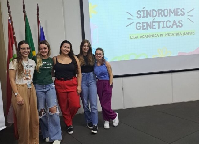 No primeiro momento, os membros da Liga Acadêmica de Pediatria abordaram as principais síndromes genéticas, com enfoque específico no diagnóstico da Síndrome de Down.