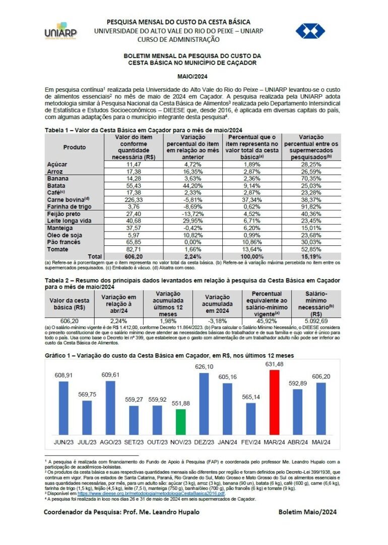 A pesquisa é realizada pela UNIARP, com recursos do Fundo de Apoio à Pesquisa (FAP), coordenada pelo professor Leandro Hupalo e executada pela bolsista Andressa Pino Garcia. Adota metodologia similar à Pesquisa Nacional da Cesta Básica de Alimentos realizada pelo Departamento Intersindical de Estatística e Estudos Socioeconômicos (DIEESE) que, desde 2016, é aplicada em diversas capitais do país, com algumas adaptações para o município integrante desta pesquisa.
