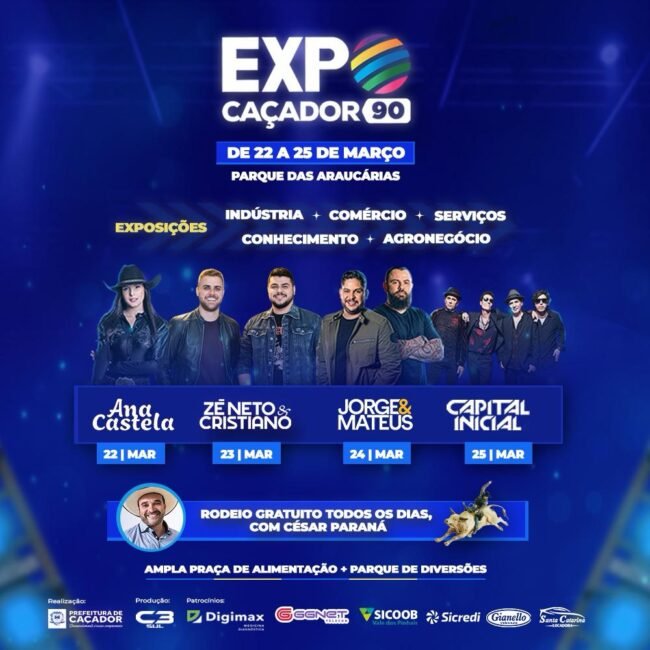 Ana Castela, com entrada gratuita no setor pista, no dia 22; Zé Neto e Cristiano, no dia 23; Jorge e Mateus, no dia 24; e Capital Inicial, dia 25 de março, feriado do aniversário de Caçador.