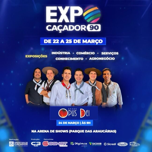 A música gospel também marcará presença nas festividades da ExpoCaçador90, com a banda Opus Dei. O show acontece no dia 24 de março, a partir das 9h, na arena de shows do Parque das Araucárias.