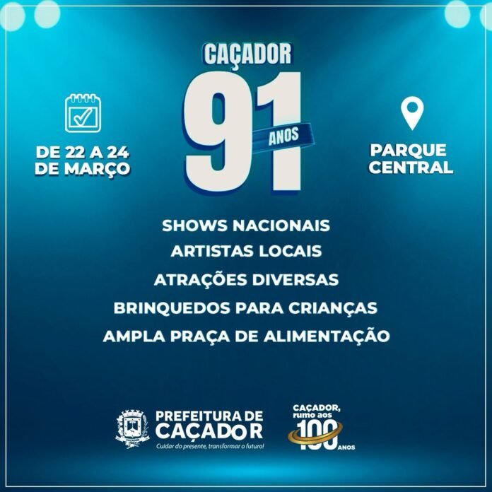 A Prefeitura está preparando uma grande festa em comemoração aos 91 anos de história de Caçador, que acontece no sábado, 22, domingo, 23, e na segunda-feira, 24, no Parque Central José Rossi Adami.