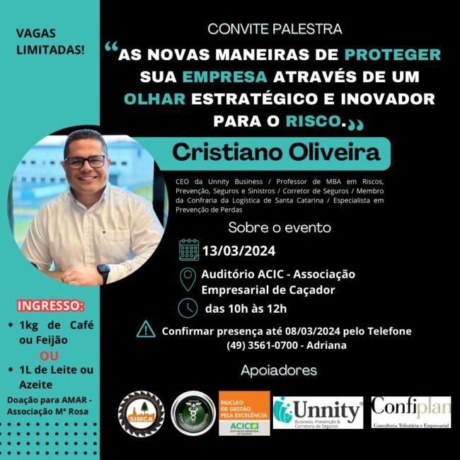 O Núcleo de Gestão pela Excelência da Associação Empresarial de Caçador (ACIC) promove dia 13 de março no auditório da entidade das 10h à 12h a palestra “As novas maneiras de proteger sua empresa através de um olhar estratégico e inovador para o risco”.