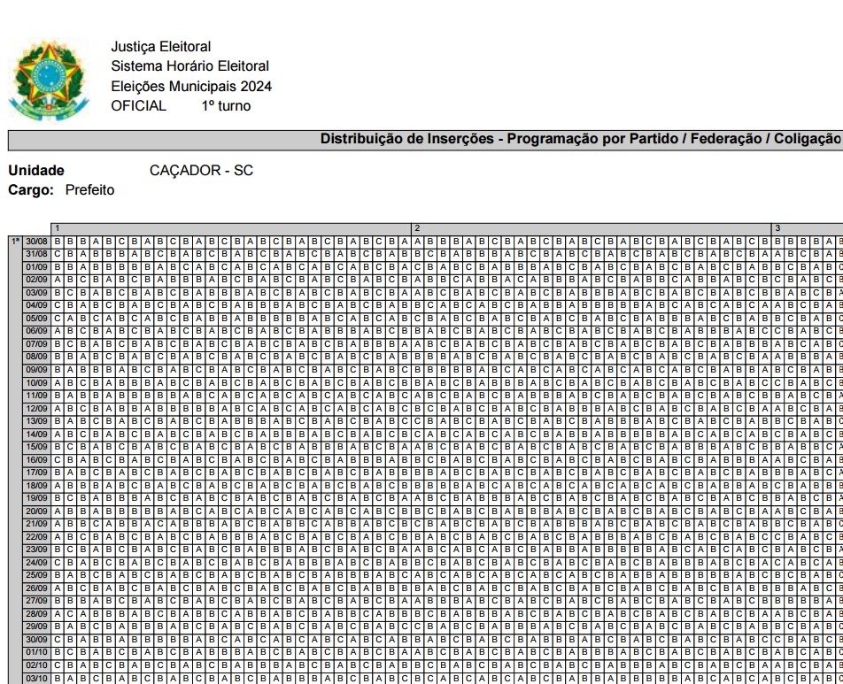Com a alteração na legislação eleitoral, os candidatos a vereador não terão mais um programa diário voltado para suas inserções. Elas acontecerão durante a programação diária, através de spots. Um total de 28 minutos são reservados diariamente para os candidatos a vereador. Veja abaixo a divisão por partido e/ou federação. Ao lado, o tempo reservado diariamente para seus candidatos a vereador em Caçador.