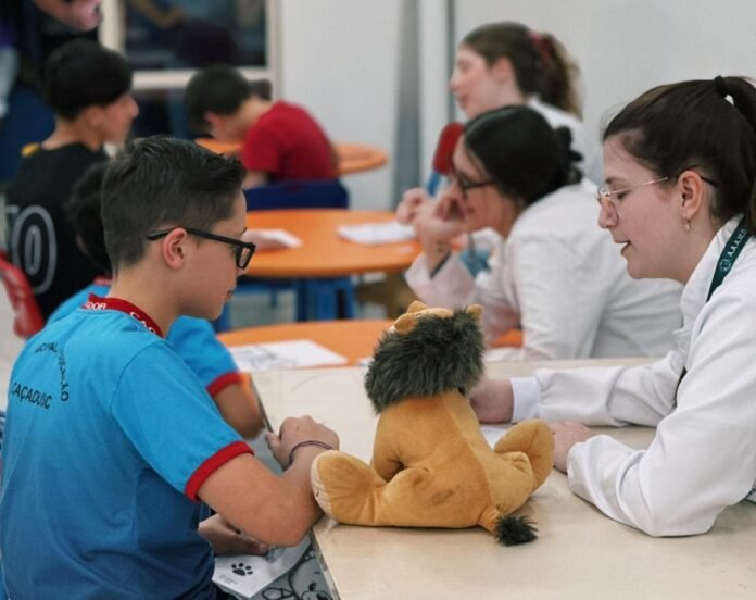 Durante a atividade, cada criança recebeu um ursinho de pelúcia e participou de um circuito interativo que simulava o ambiente hospitalar, com estações de anamnese, curativos, centro cirúrgico e raio-X.