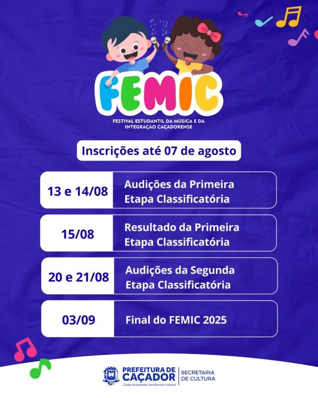 As inscrições para o 6º Festival Estudantil da Música e da Integração Caçadorense (FEMIC) 2025, já estão abertas e seguem até o dia 07 de agosto. O evento é direcionado às crianças e adolescentes das escolas de Caçador, matriculadas na rede municipal, estadual, federal ou particular.