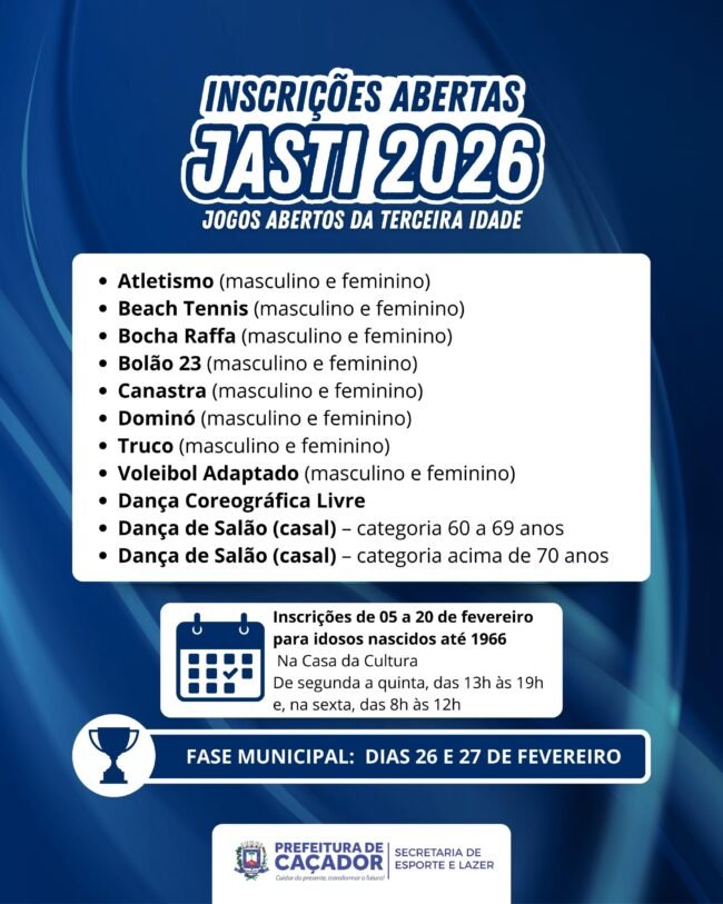 A Secretaria de Esporte e Lazer da Prefeitura de Caçador abre, entre os dias 05 e 20 de fevereiro, as inscrições para a Fase Municipal dos Jogos Abertos da Terceira Idade (JASTI) 2026. A competição é voltada a idosos com 60 anos ou mais, e tem como objetivo incentivar a prática esportiva, a convivência e a qualidade de vida.
