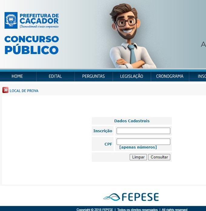Os locais e horários das provas do Concurso Público da Prefeitura de Caçador, devem ser conferidos diretamente no site da Fepese (https://2024concursocacador.fepese.org.br/), clicando no link “Local de Prova”, inserindo na sequência o número de inscrição e o CPF. Outra opção é ir no “Acesso restrito ao Candidato”, preenchendo com o código de inscrição e senha.