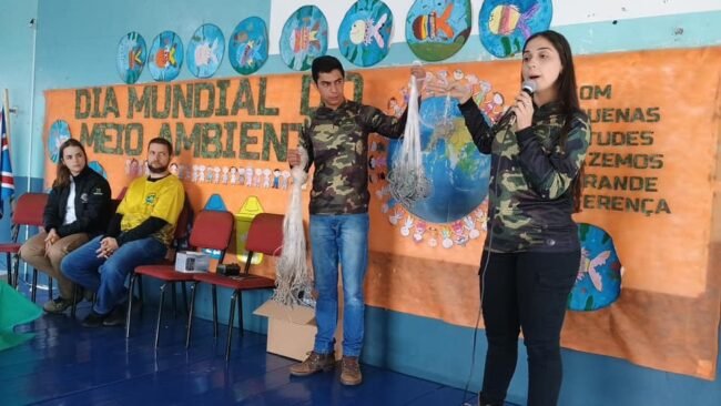A primeira palestra teve como tema: “Monitoramento da fauna terrestre e aquática” e foi ministrada pelos biólogos da empresa Arbórea Estudos Ambientais: Lidiorlan Bortolaz e Hiasmini Tomazeli. Eles apresentaram para as crianças o trabalho de monitoramento da fauna silvestre e da ictiofauna, o levantamento dos seres vivos do Rio do Peixe na área de abrangência de uma hidrelétrica.