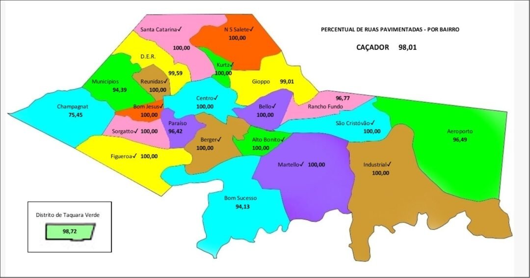 Bairros como o Martello, São Cristóvão, Bello, Alto Bonito, Santa Catarina, Sorgatto, Berger entre outros (veja mapa), já têm 100% de pavimentação em suas ruas.