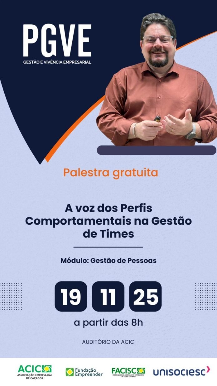 Associação Empresarial de Caçador (ACIC) promove mais uma palestra gratuita dia 19 de novembro a partir das 8h, trazendo a Caçador o professor Fabrício Albrecht, que abordará o tema “A Voz dos Comportamentais na Gestão de Times”.