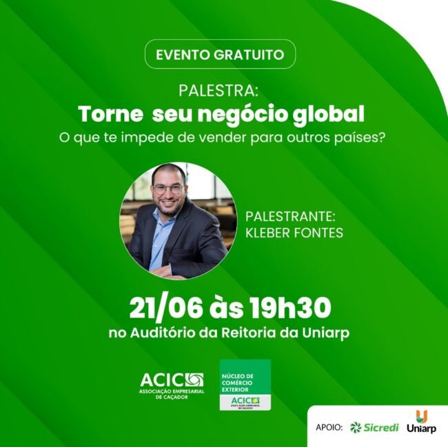 A palestra será ministrada por Kleber Fontes, formado em Comércio Exterior pela UNINTER, com MBAs em Gestão Estratégica de Empresas, Comércio Exterior e Negócios Internacionais pela Fundação Getúlio Vargas (FGV) e Gestor Leader/Coach pela Sociedade Latino-Americana de Coaching (SLAC).