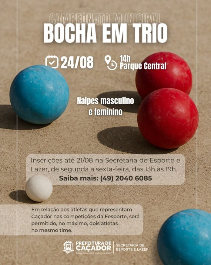 A Prefeitura de Caçador, por meio da Secretaria de Esporte e Lazer, promove o 1º Campeonato Municipal de Bocha em Trio, nas categorias masculino e feminino. As disputas serão realizadas exclusivamente na Cancha do Parque Central, no dia 24 de agosto, a partir das 14h, integrando a programação do Circuito da Saúde, promovido pela Universidade Alto Vale do Rio do Peixe (UNIARP).