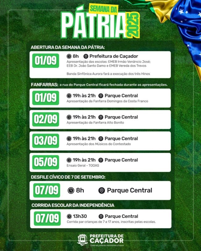A Prefeitura de Caçador, através da Secretaria de Educação, divulga uma programação especial em alusão à Semana da Pátria 2025. As atividades acontecem entre os dias 1º e 7 de setembro.