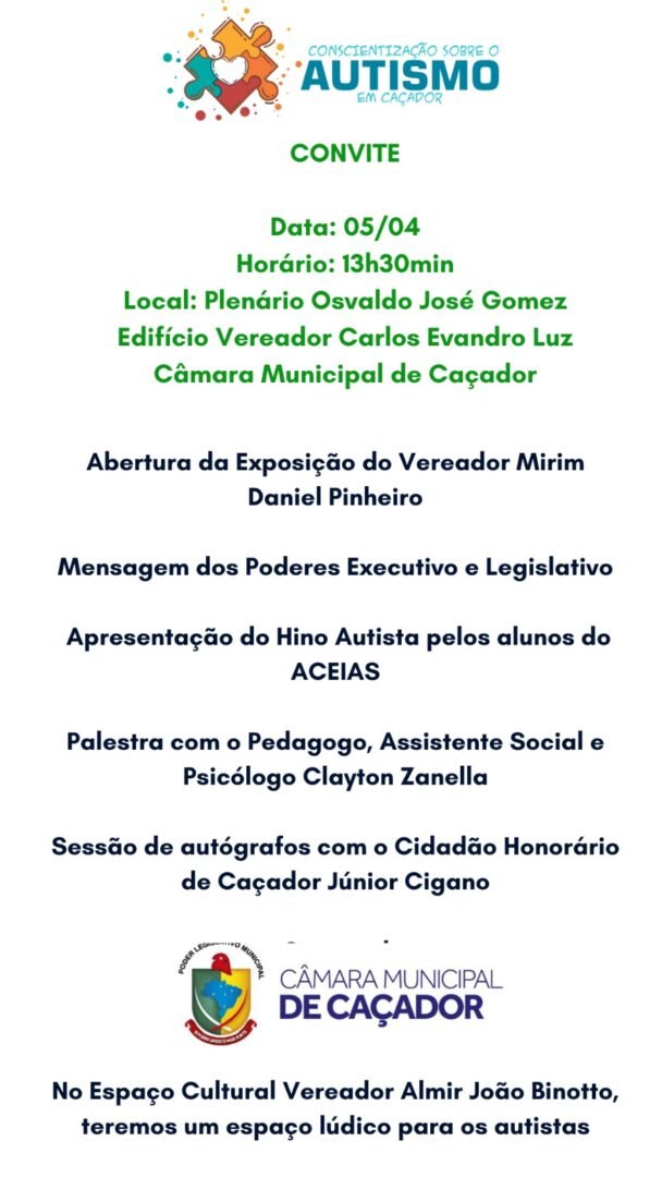 “Além disso, teremos um espaço recreativo voltado aos autistas, que poderão acompanhar toda a programação feita com muito carinho e voltada para eles. Convidamos toda a comunidade que puder se fazer presente, para que prestigie e debata conosco este tema, cada vez mais importante e presente em nosso dia a dia”, destaca o presidente do Legislativo, Itacir Fiorese (Fically).