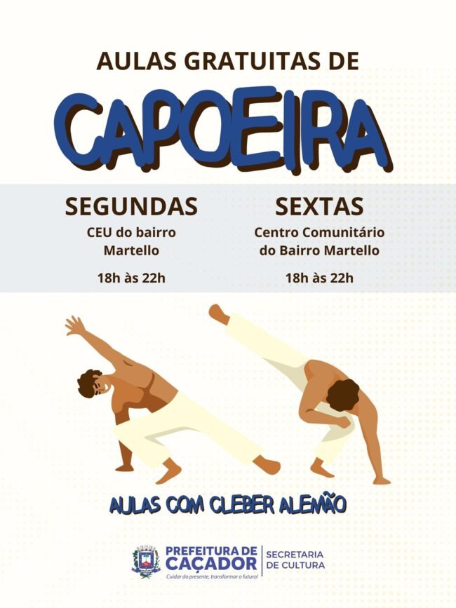 A Prefeitura de Caçador, por meio da Secretaria de Cultura, está com inscrições abertas para aulas gratuitas de capoeira. As atividades acontecem em dois locais do bairro Martelo.