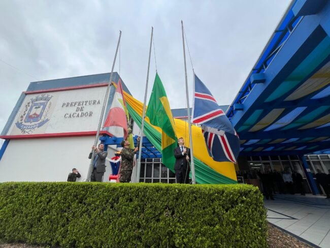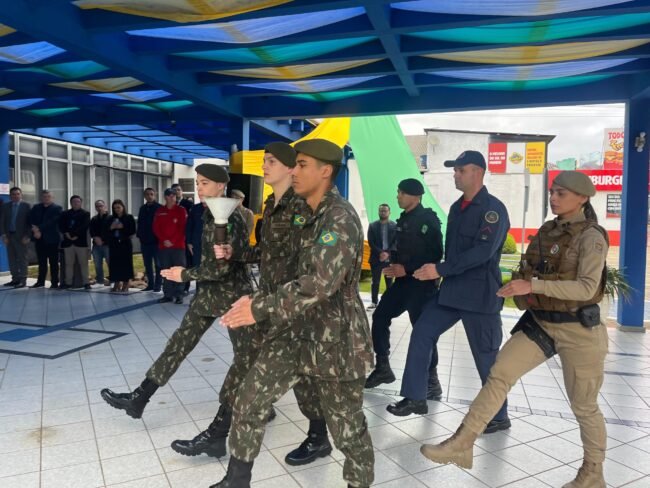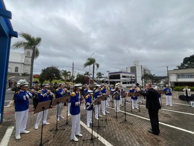 A Prefeitura de Caçador realizou, nesta segunda-feira, 1º de setembro, a cerimônia de abertura da Semana da Pátria, que neste ano tem como tema “Cidadania se constrói com Educação e Respeito”. A solenidade contou com a presença de autoridades, alunos, professores e da Banda Sinfônica Aurora.