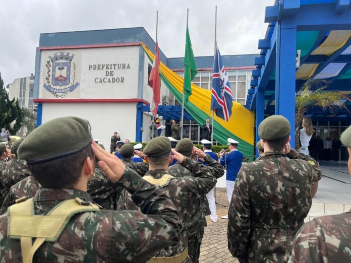 A Prefeitura de Caçador realizou, nesta segunda-feira, 1º de setembro, a cerimônia de abertura da Semana da Pátria, que neste ano tem como tema “Cidadania se constrói com Educação e Respeito”. A solenidade contou com a presença de autoridades, alunos, professores e da Banda Sinfônica Aurora.