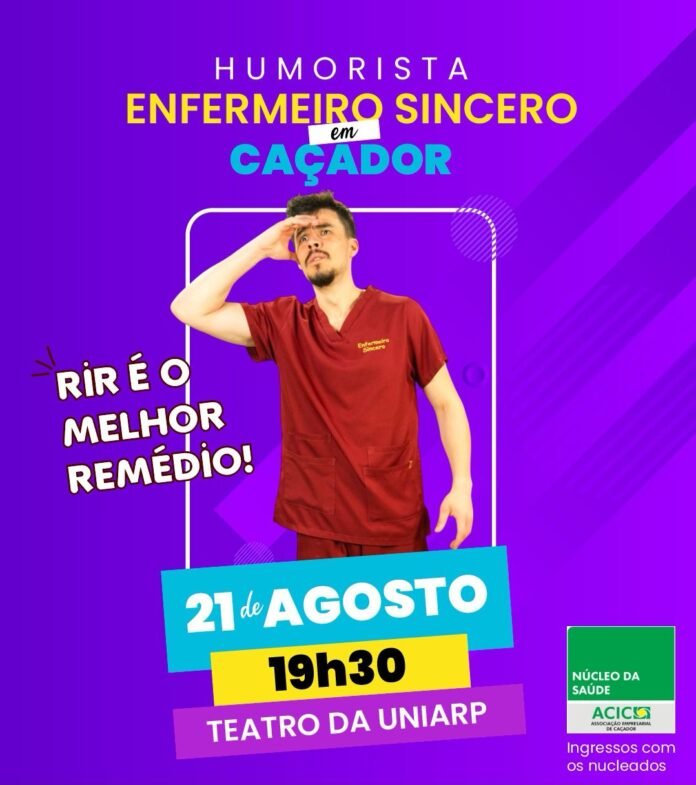 O Núcleo de Saúde da Associação Empresarial de Caçador (ACIC) promove nesta quinta-feira (21) o stand-up “Rir é o Melhor Remédio”, estrelado pelo humorista Enfermeiro Sincero. O espetáculo será realizado às 19h30, no Teatro da Uniarp.