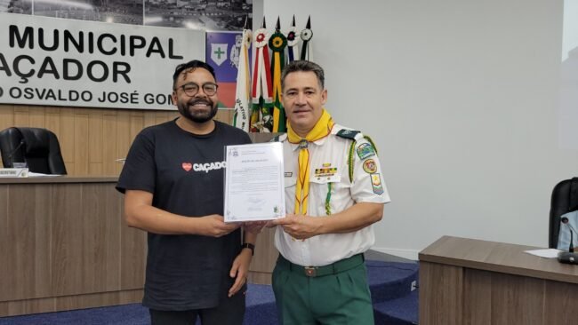 A Câmara Municipal de Caçador reconheceu na noite desta segunda-feira (18), por meio de moção de aplausos de autoria do vereador Leandro Sawchuk (União Brasil), o trabalho do Clube Desbravadores Alfa. O documento foi entregue ao diretor Leomar Ferreira, estendendo os cumprimentos a toda diretoria e integrantes pelos trabalhos de excelência, compromisso e contribuição com o desenvolvimento do município.