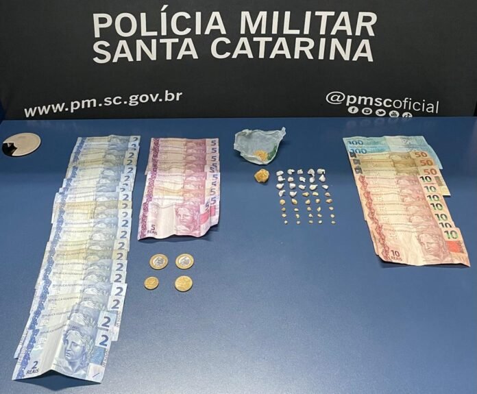 No local, os policiais apreenderam 32 pedras de crack, totalizando 11,5 gramas, além de dinheiro e materiais utilizados para o preparo da droga.